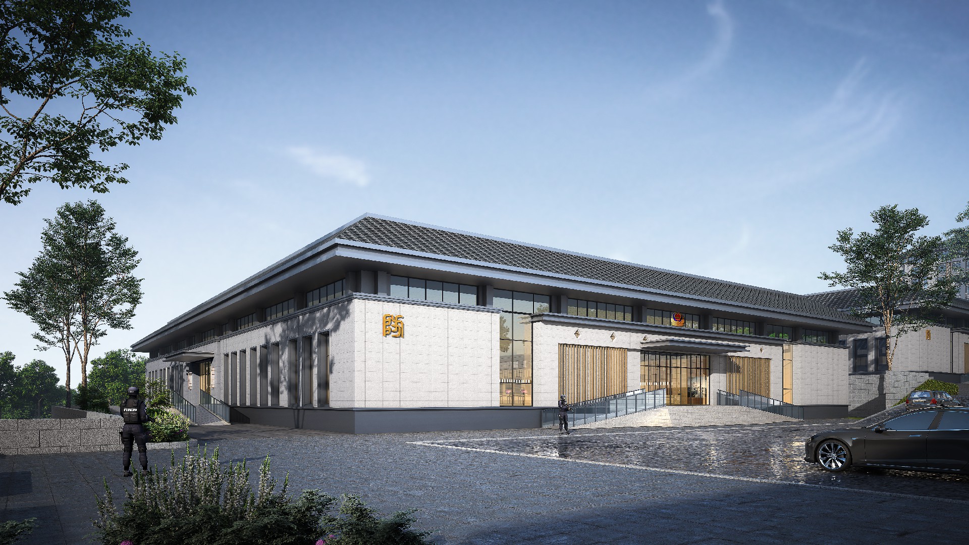 山東出入境邊防檢查總站輪訓(xùn)大隊(duì)(南山)營(yíng)區(qū)改造設(shè)計(jì)項(xiàng)目,總占地面職約 200 畝,對(duì)營(yíng)區(qū)內(nèi)主要建筑及附屬設(shè)施進(jìn)行功能改造,改造面積約總建筑面積約 1.6萬(wàn)平方米。"一人之形象,國(guó)家之縮影;一人之舉止,民族之風(fēng)貌。邊防檢查人員的形象和服務(wù)至關(guān)重大。本項(xiàng)目整體規(guī)劃格局莊重大氣,建筑效果協(xié)調(diào)統(tǒng)一,室內(nèi)裝飾溫馨舒適,充分考慮該地塊地形現(xiàn)狀,結(jié)合現(xiàn)有道路情況,通過(guò)設(shè)置多個(gè)臺(tái)地解決場(chǎng)地內(nèi)高差及功能分區(qū)的需求。本設(shè)計(jì)全面展現(xiàn)項(xiàng)目生態(tài)性、智能化。信息化、安全性等特色,倡導(dǎo)綠色健康、可持續(xù)發(fā)展的建筑模式。建筑整體設(shè)計(jì)大方、莊重.典雅,在設(shè)計(jì)細(xì)節(jié)上體現(xiàn)項(xiàng)目?jī)?yōu)良品質(zhì)。